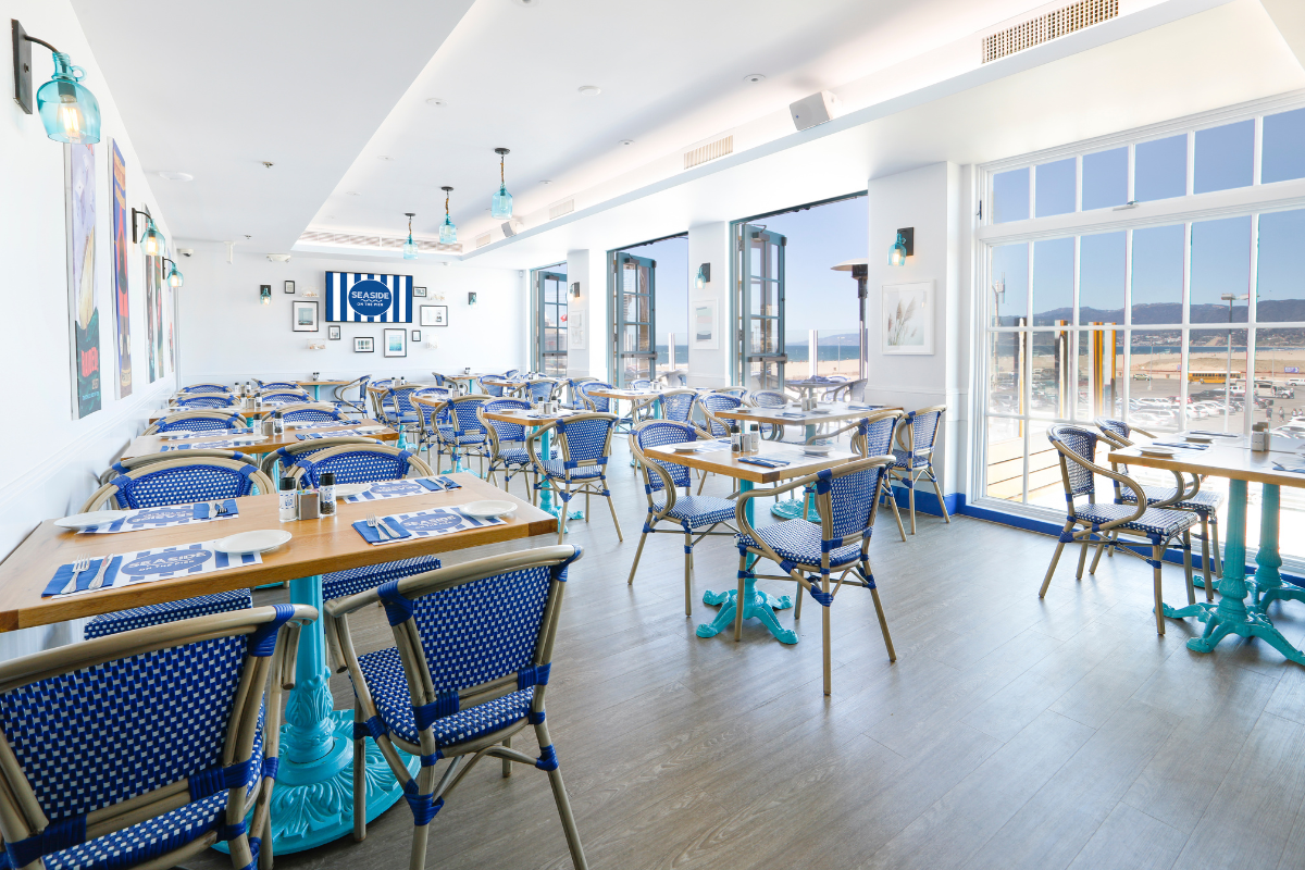Navy & white set the tone at this Santa Monica fish shack overlooking the Pacific.