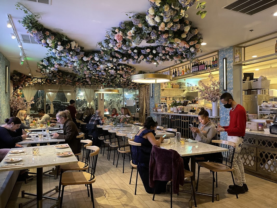 Pastels, plants & flowery wallpaper outfit this cozy destination that serves New American dishes.
