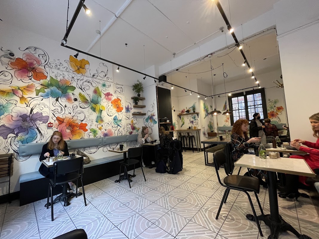 Independent cafe with pendant lights and murals, for gourmet coffees, breakfasts and light meals.
