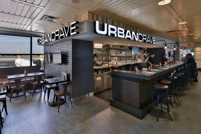 A selection of international comfort foods is served with creative presentations in the airport.
