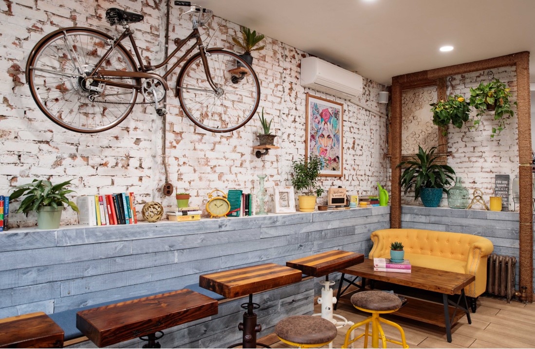 Housemade pastries & snacks with Balkan influences in a hip coffee bar featuring shabby-chic decor.