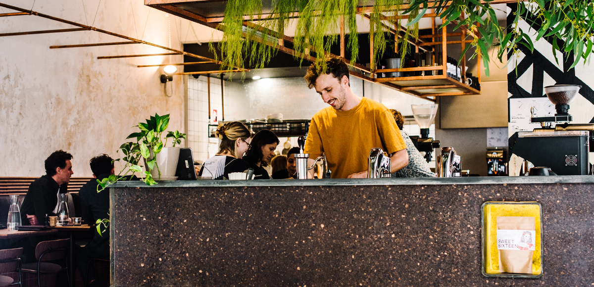 Bustling streetside cafe prepping freshly roasted coffee & seasonal bites in cool surrounds.