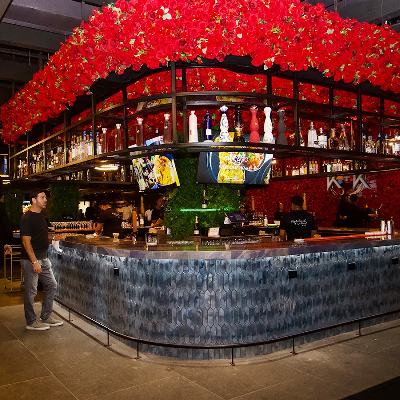 Global comfort fare like fried chicken & waffles, plus cocktails, served in a flashy lounge setting.