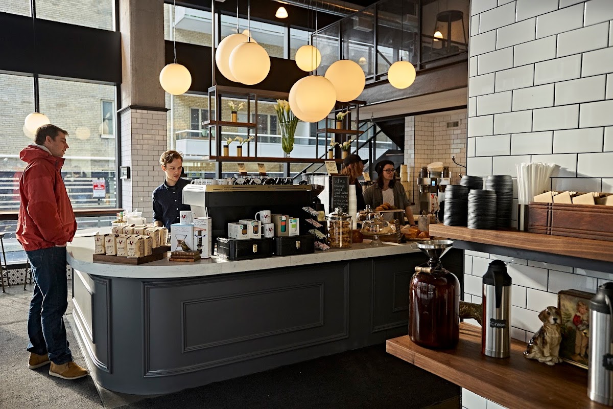 Espresso drinks & baked goods offered in an industrial space with huge windows & a seating loft.