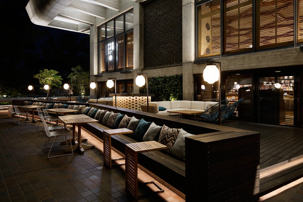 Wraparound windows & a terrace at a sleek modern restaurant for upscale European & Japanese dining.